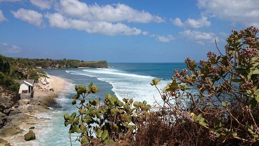 It is one of Bali's famous beaches, as it is situated on a white stone hill near Pecatu, on the Uluwatu peninsula in the southern portion of the island. It is a suitable location to spend time for relaxation and a romantic day out due to the tropical ambiance and the cool sea wind. Every day at sunrise and sunset, the white sand turns golden, flowing like sheer ingots of gold.