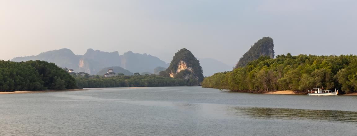 Khao Khanab Nam, also known as Khao Khanap Nam, is one of the unique places to visit in Krabi, featuring two large limestone mountains standing out against the landscape. These striking formations flank the Krabi River, creating an incredible vista to explore and photograph. While in the area, you can expect magnificent natural beauty, fascinating caves adorned with stalactites and stalagmites, and a peaceful mangrove forest.