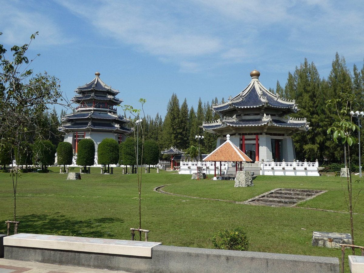 A: The park showcases authentic Chinese Three Kingdoms period history through over 100 life-sized warrior statues, seven-story pagodas, imperial palace replicas, and traditional Chinese gardens spanning 500 rai near Silverlake.