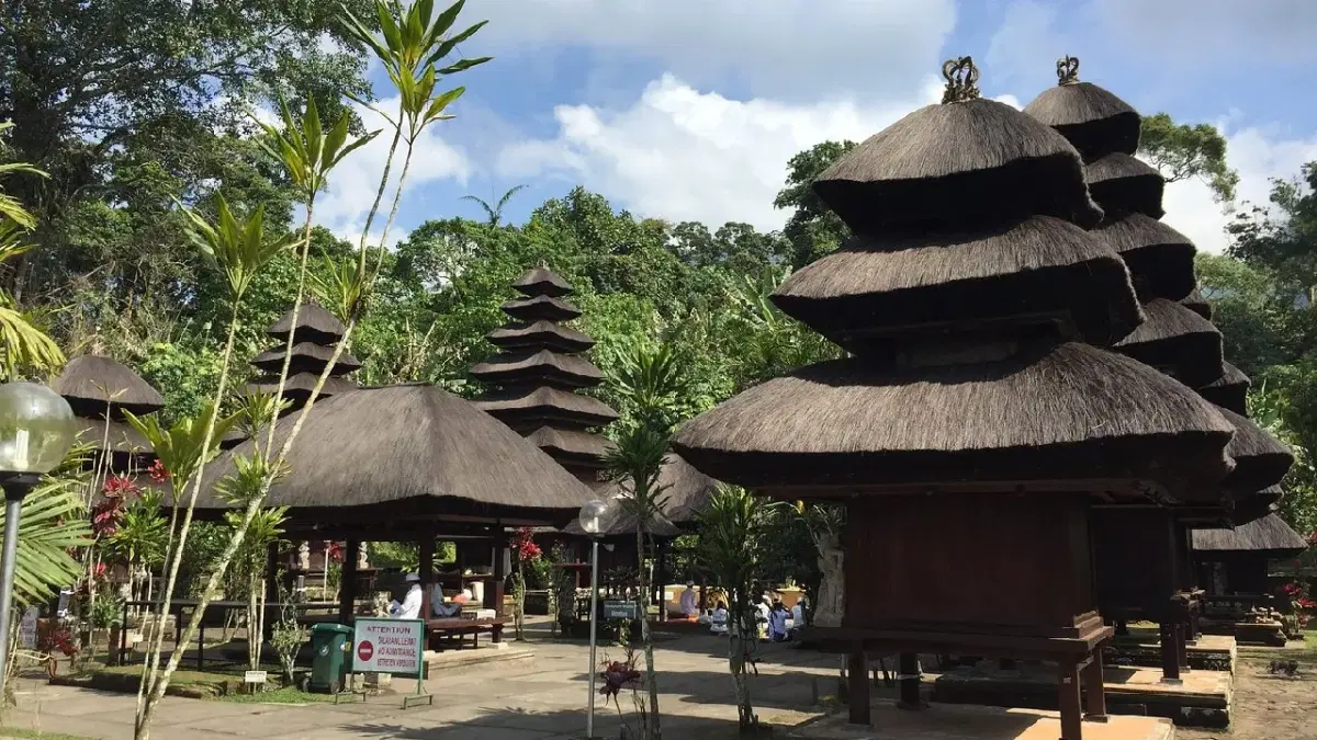 The 7-Tiered Meru: A Sky-High Tribute: It is a multi-roofed shrine dedicated to the God of Batukaru Mountain and is built with a dark, fibrous palm-leaf roof (ijuk) that darkens in color and gives it a mystical appearance when it rains.