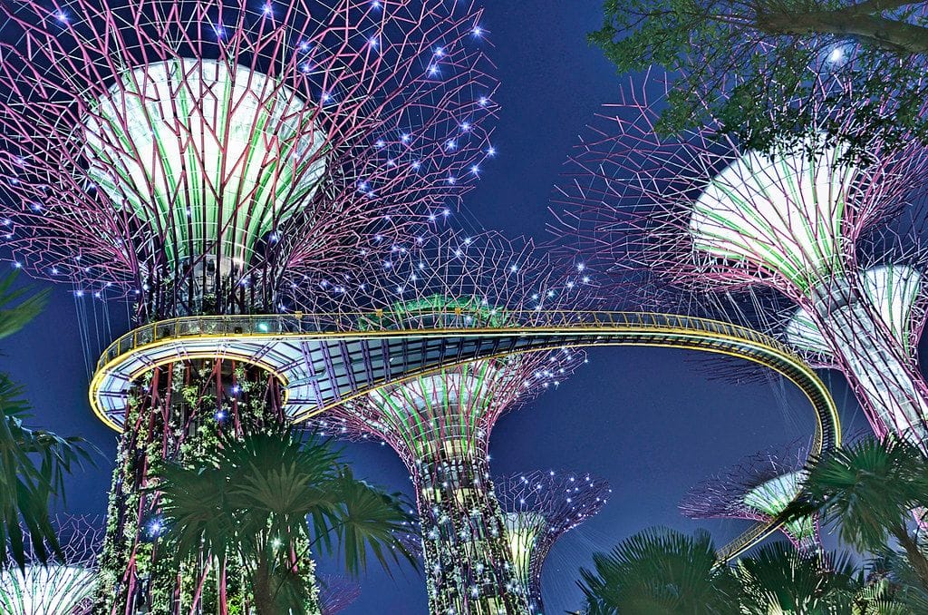 Night Visit: When the Supertrees Come Alive: The Skyway becomes magical during the night when the Supertrees light up the night with neon blues, purples, and golds.