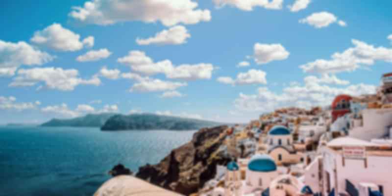 Top attractions in Greece: Acropolis of Athens, Temple of Olympian Zeus, Knossos Palace, Fira, and Oia.