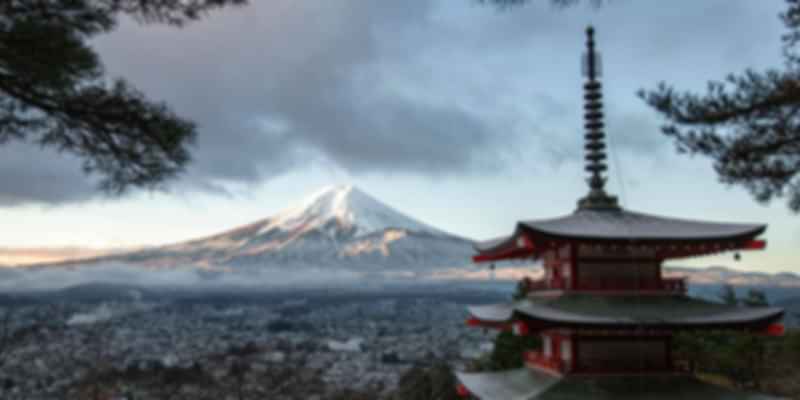 Top attractions in Japan: Arashiyama Bamboo Grove, Senso-ji Temple, Shibuya Crossing, and Fuji Five Lakes.