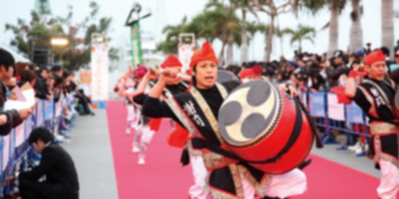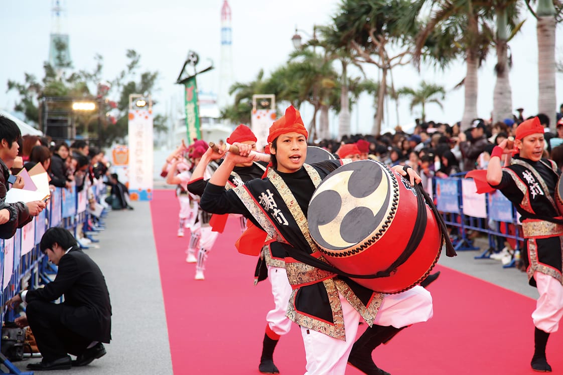The traditional drumming and dances of the Okinawans are used to make a colourful celebration at the coast.