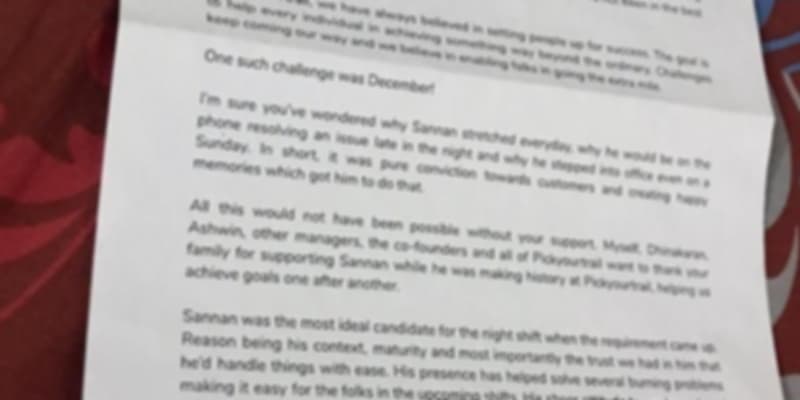 It was a thank you note addressed to the families. Each one personalized with something unique written about each teammate. The timing was perfect, the peak had almost come to an end, it was new year’s eve. The letter was addressed to the family thanking them for the support and acknowledging the great work put in by their daughter, son, or spouse. The reaction was overwhelming. We had happy parents, grandparents, and a team which was super elated by the gesture and proud to reflect at a month well executed. It’s amazing how a casual conversation over tea can lead to so much happiness ?