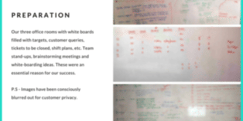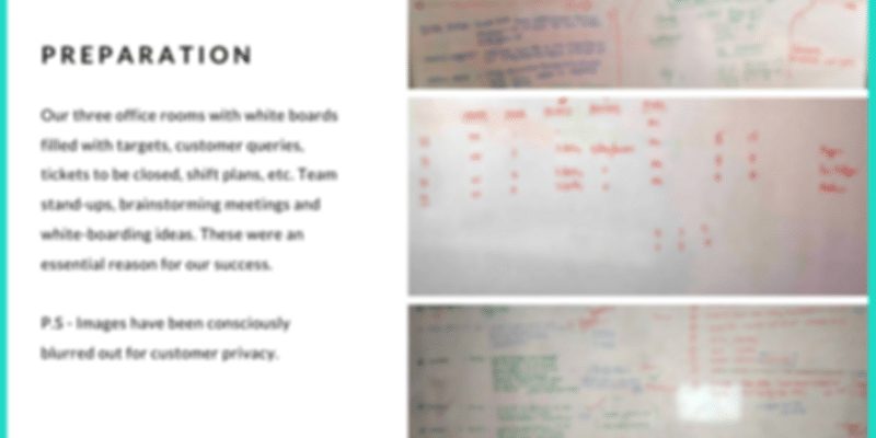 Another conscious call we took as a team is to move away from an only Tech-led approach. I am a Pen and a Paper guy. I keep daily to-do lists and get a kick when I check off a box. We could share information online between teams and people across shifts. But it made it difficult to discuss and execute. So, we moved to a whiteboard. All our rooms had whiteboards full of to-do lists and customer handover information from one shift to another. We had a near-zero loss of information, thanks to this approach.
