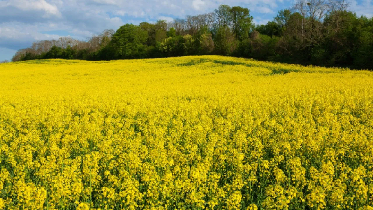 The spring season in Normandy reveals white and pink paradise as millions of apple trees bloom and the vibrant yellow flowers (colza) cover Normandy fields in spring. The vast, bright yellow crops define the spring landscape before later summer blooms arrive.