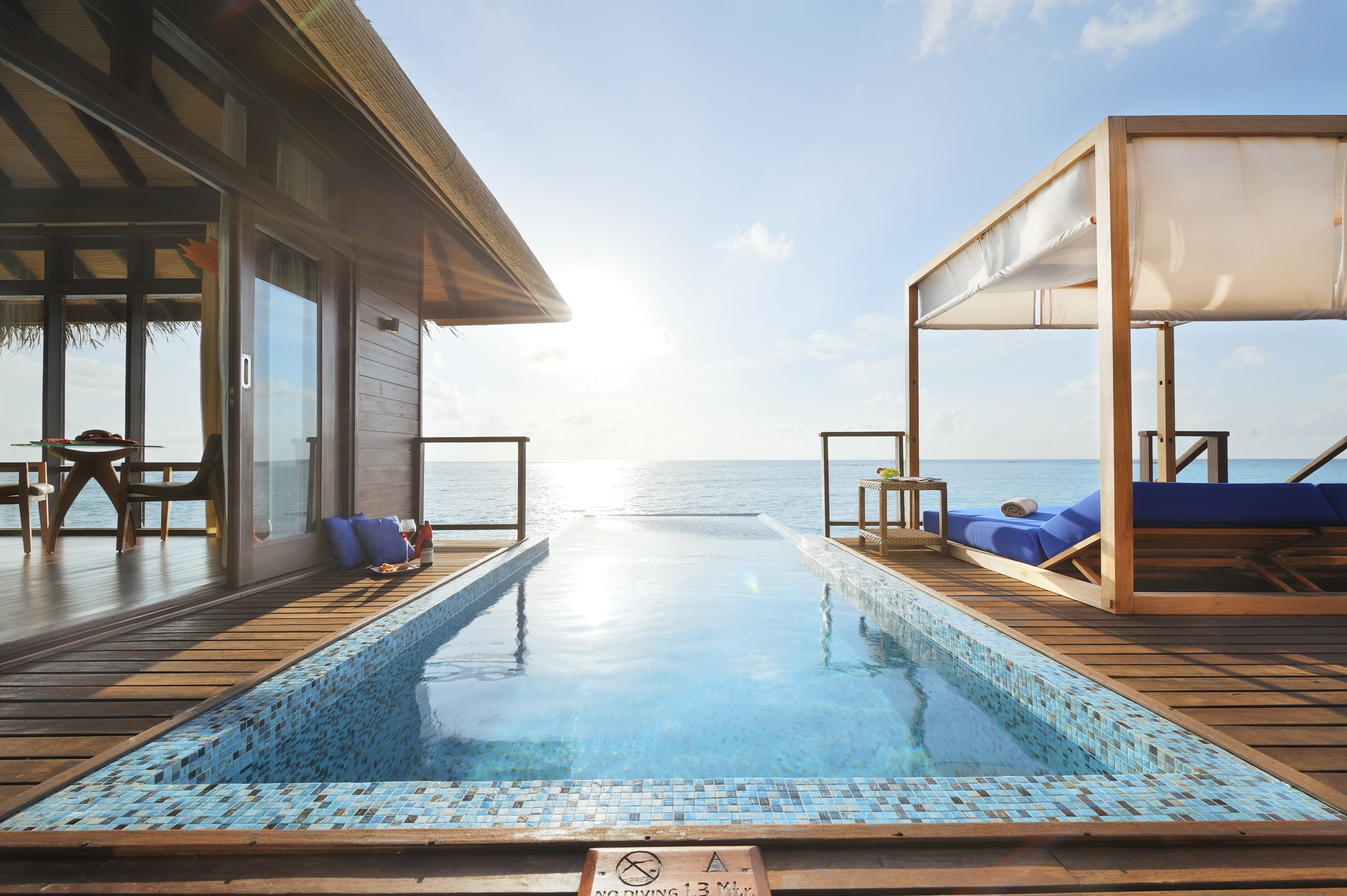 The exclusive Maldives villas at Coco Bodu Hithi covers 184 square metres of space. With high ceilings, huge picture windows, exquisite décor, a four-poster daybed on the deck, private wine cellar, living area, infinity pool and so on! A perfect and cosy getaway for your vacation!
