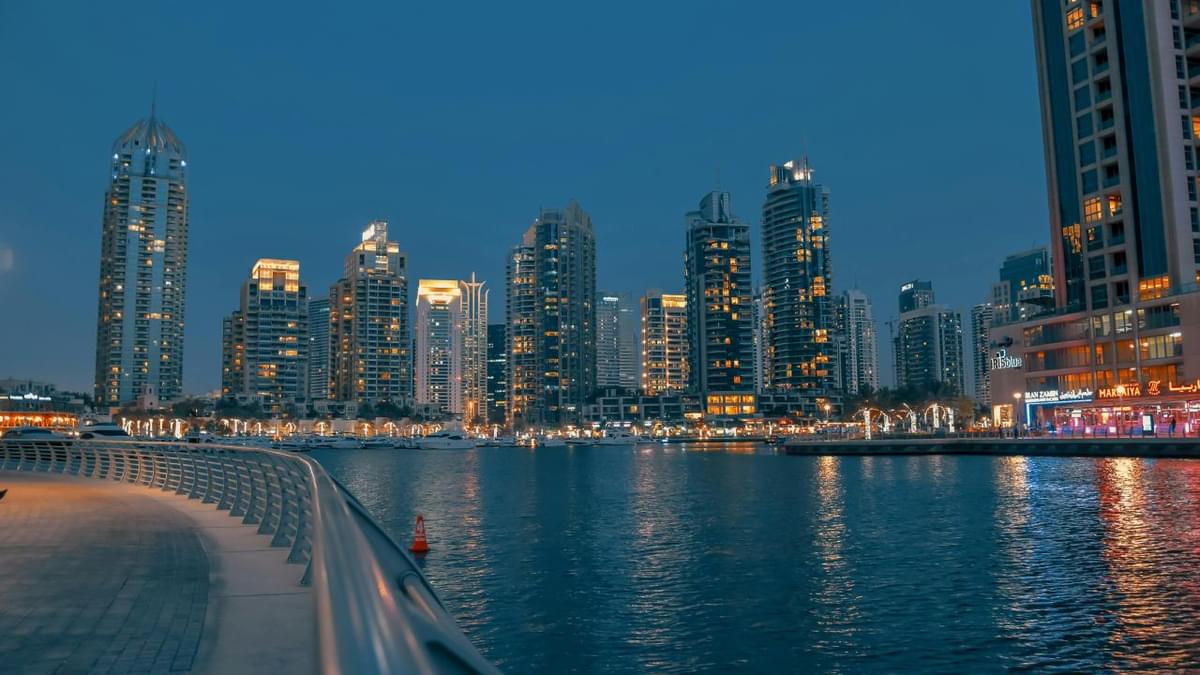 This seaside walkway reveals the modern urban planning of Dubai through the high-rise residential towers that are mirrored in the calm water of the marina.