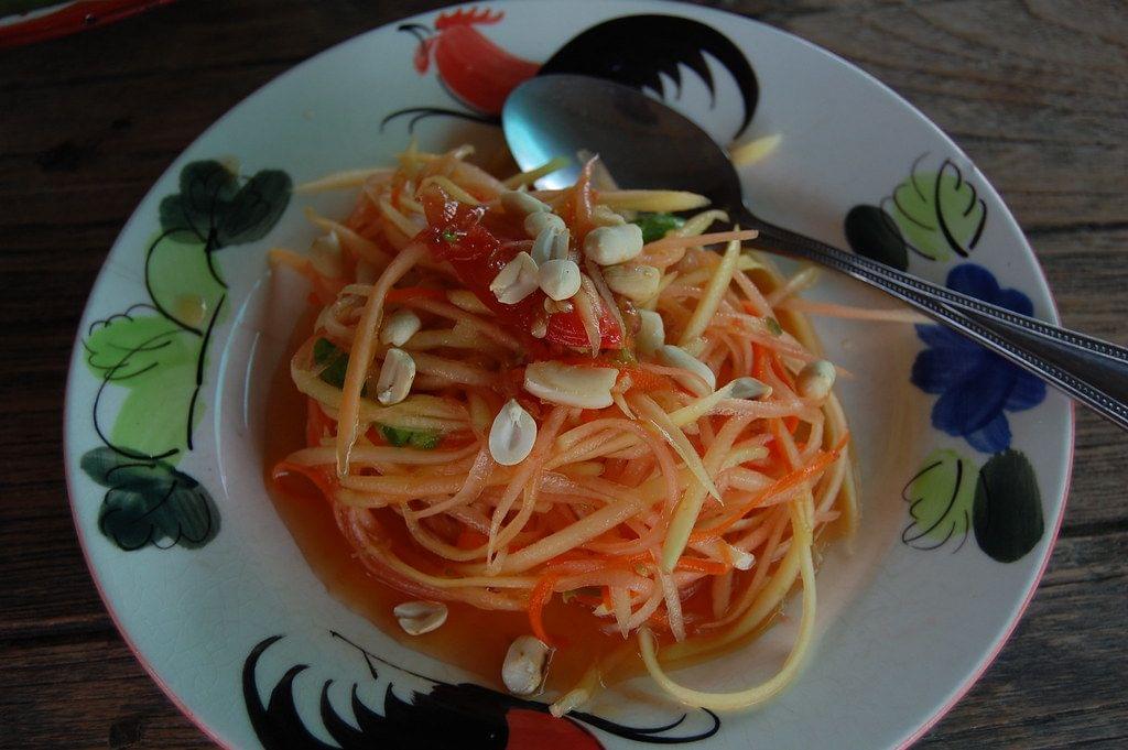 Som Tum masterfully balances the contrasting flavours of papaya, tomatoes, long beans, peanuts, dried shrimp and chilli peppers. This spicy salad is a must-try Thai street food and one of the best dishes to try in Thailand.