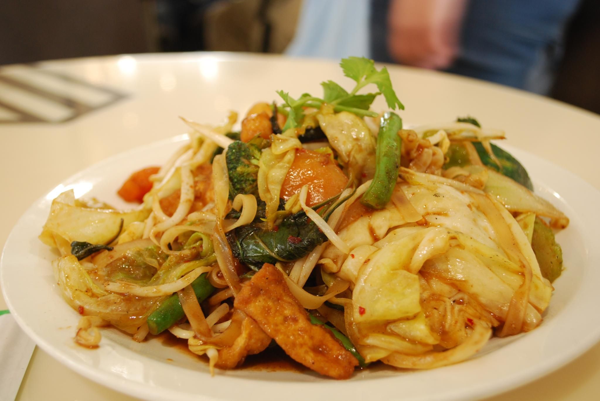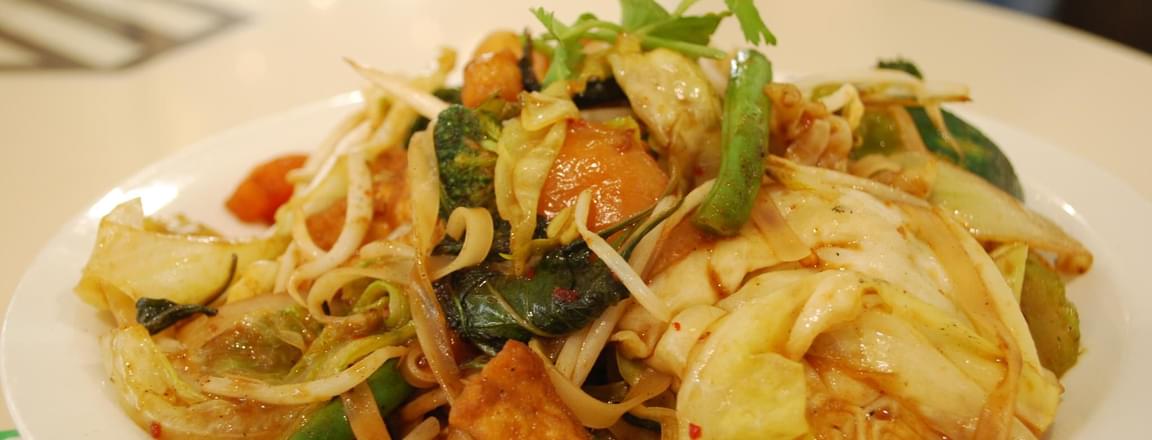 This popular Thai dish can be easily modified. Order tofu, not shrimp, no egg (mai sai khai), and soy sauce, not fish sauce. Search the sellers with clear peanut warning signs in case of allergies.