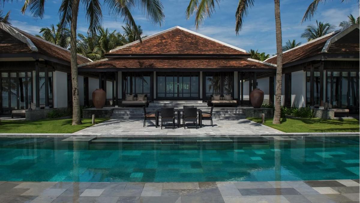This beachfront retreat in southern Vietnam offers traditional design with modern luxury, framed by tropical gardens and ocean views.